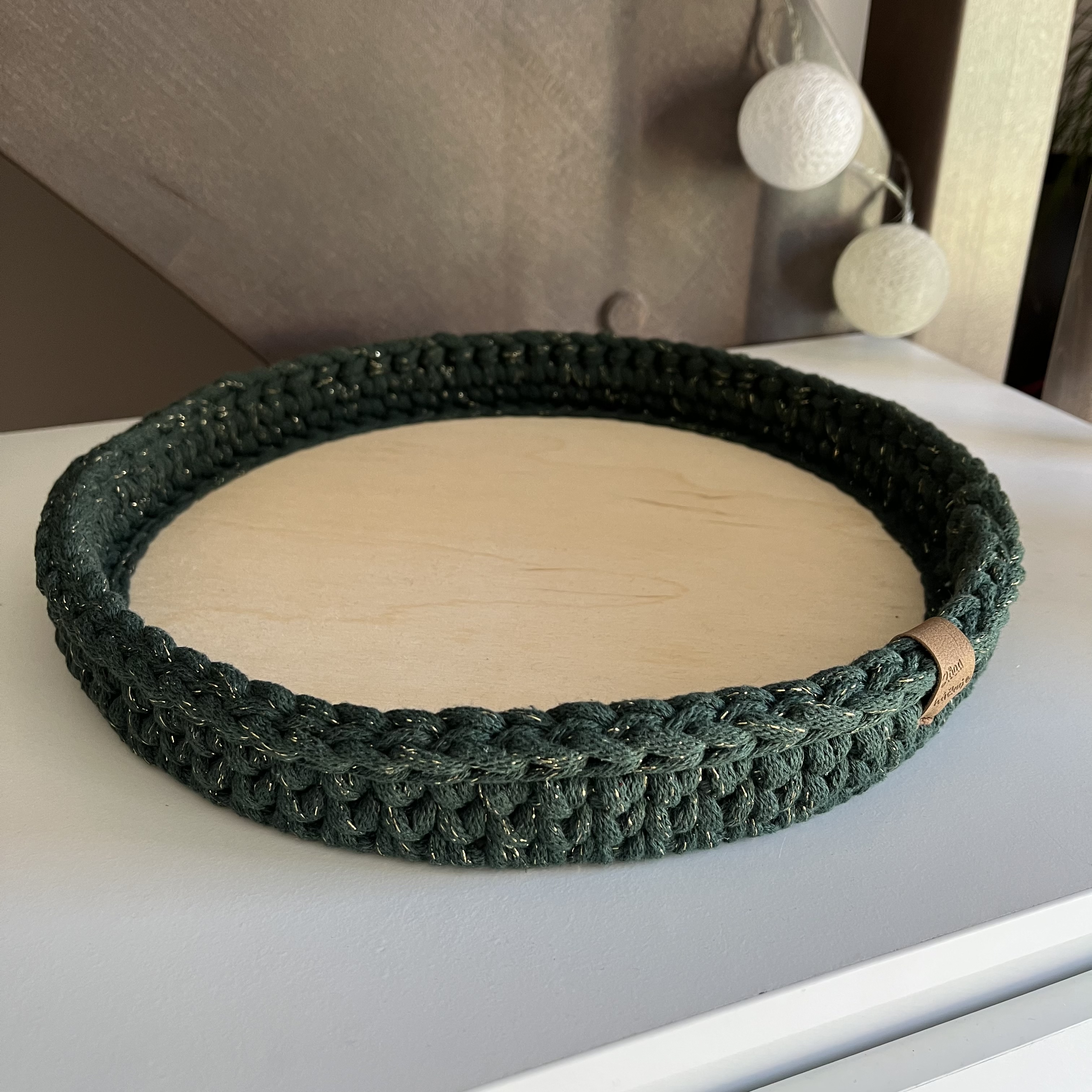 Průměr tácu je 30 cm. Tác je vysoký cca 3,5 cm. Základní rozměr je rozměr dřevěného dna, z důvodu použití silné příze bude výsledný rozměr o 1-2 cm větší.