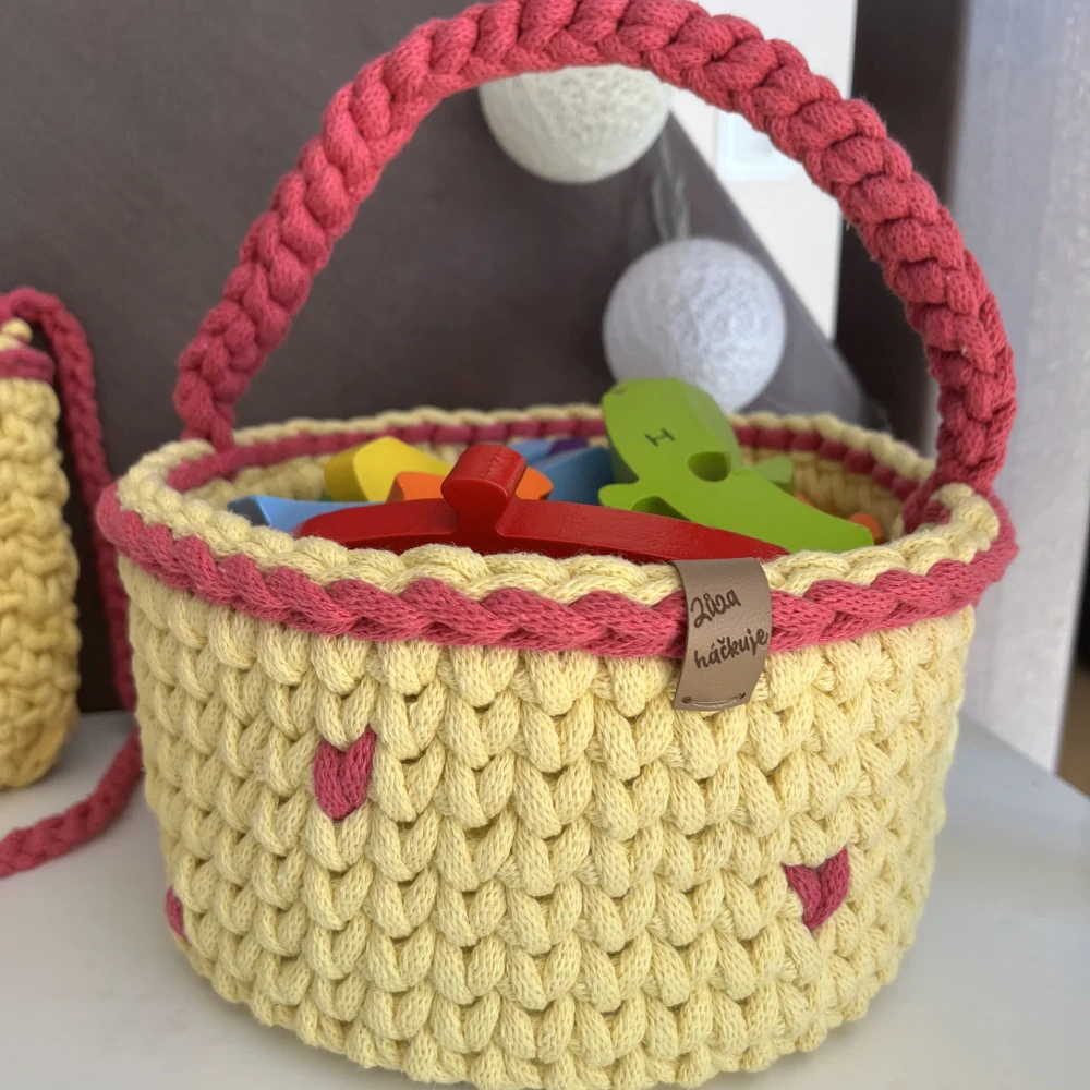 Úložný košík na hračky je celoháčkovaný, tedy bez pevného, dřevěněho dna, je tedy lehčí, přesto je pořád pevný a drží svůj tvar. Košík má ouško na nošení, takže si děti mohou hračky i přenášet.