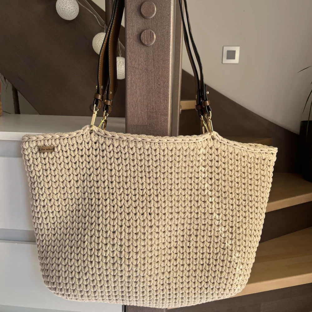 Ručně háčkovaná kabelka shopperka s pevnými a širokými uchy z koženky. Velká a prostorná, uvnitř má malou kapsičku na drobnosti, zapínání na zip.