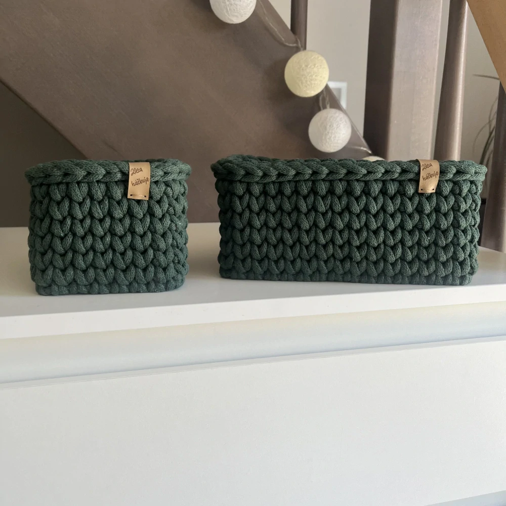 Tmavě zelená sada háčkovaných košíků ideální do koupelny na kosmetiku a malé drobnosti, do kuchyně na parapet nebo kamkoliv jinam dle vaší preference.