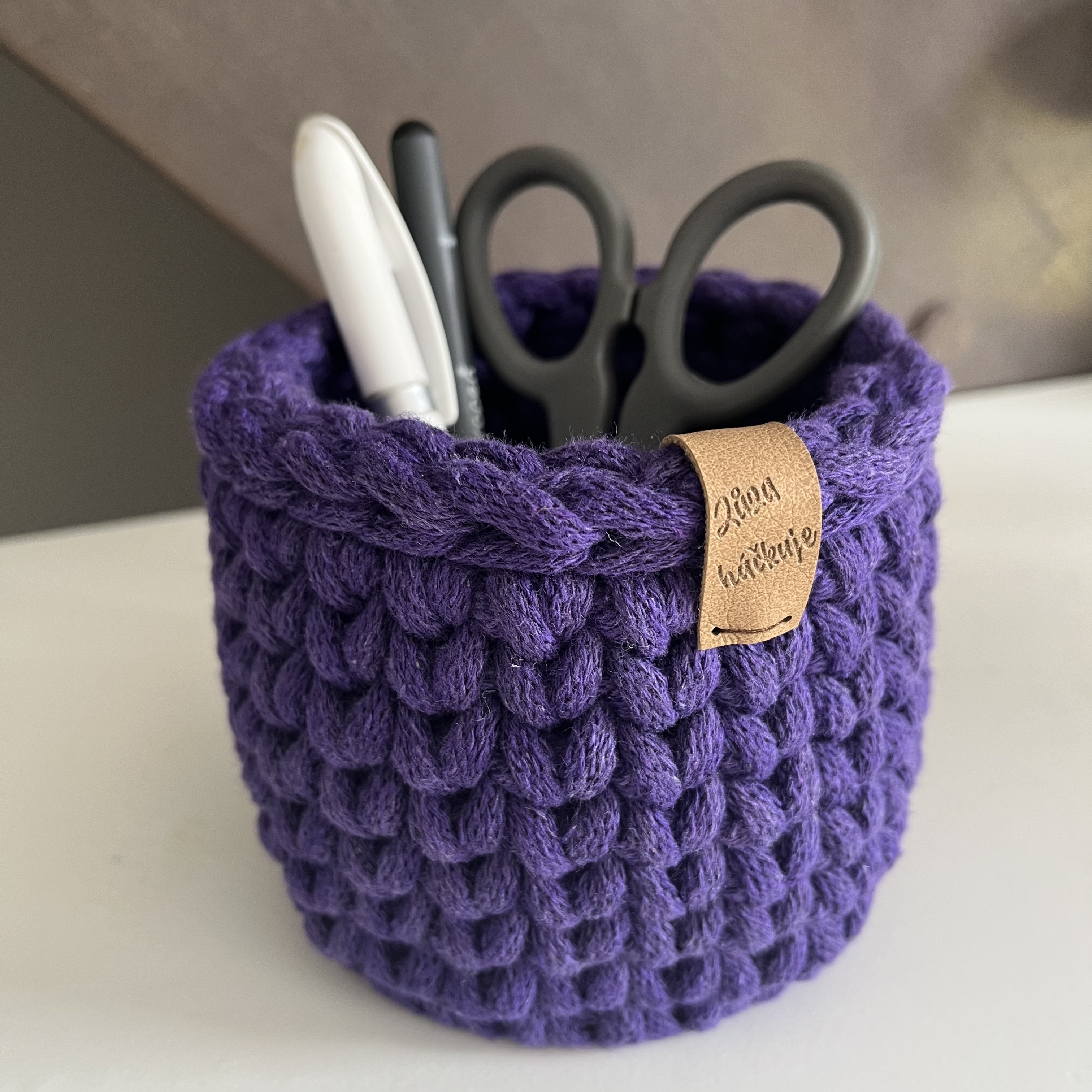 Průměr tužkovníku je 10 cm, výška cca 10 cm. Základní rozměr je rozměr dřevěného dna, z důvodu použití silné příze bude výsledný rozměr o 1-2 cm větší.
