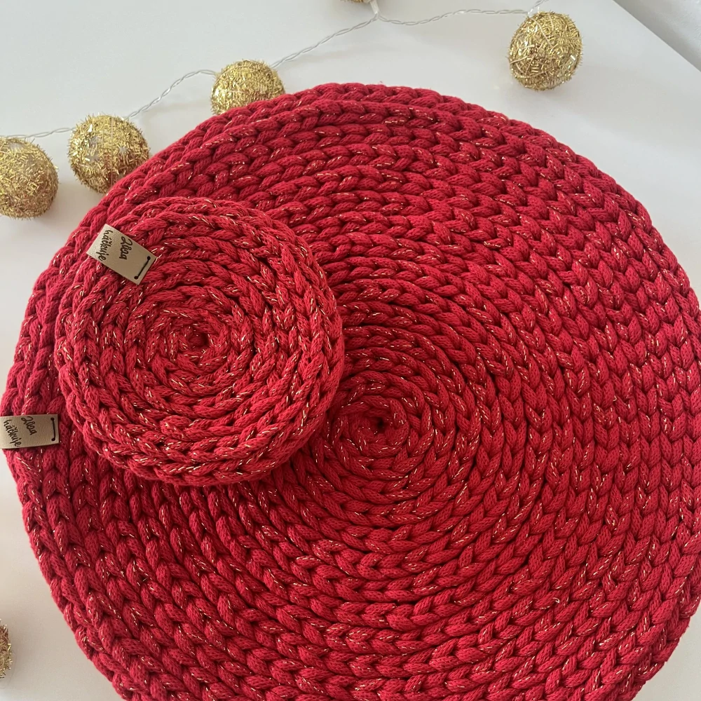 Do obýváku pod dekoraci/svíčky nebo jako doplněk k prostírání na jídelní stůl. Vánoční varianta oblíbených podšálků se zlatou nitkou. Vyberte kteroukoliv barvu, na přání vám pak bude vyrobena se zlatou nitkou.