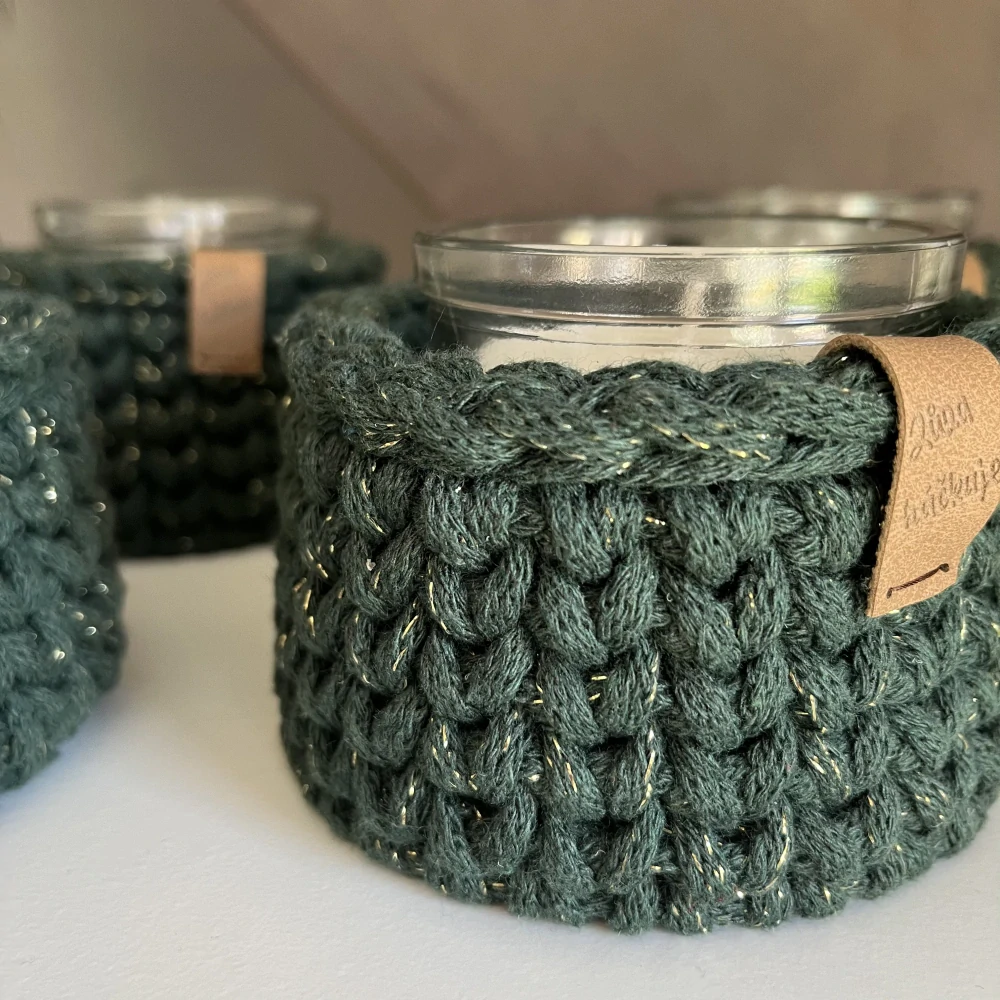 Průměr svícnu je 10 cm, výška cca 6 cm. Základní rozměr je rozměr dřevěného dna, z důvodu použití silné příze bude výsledný rozměr o 1-2 cm větší.