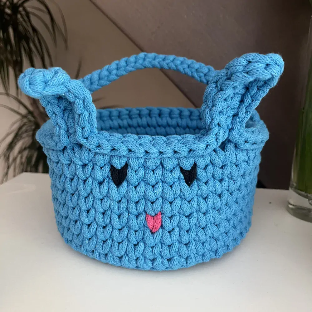 Košík do dětského pokoje na hračky. Košík je celoháčkovaný, tedy bez pevného, dřevěněho dna, je tedy lehčí, přesto je pořád pevný a drží svůj tvar. Košík má ouško na nošení, takže si děti mohou hračky i přenášet. Zvířátko má obličej a ouška, na výběr jsou ouška alá zajíček, pejsek, kočička.